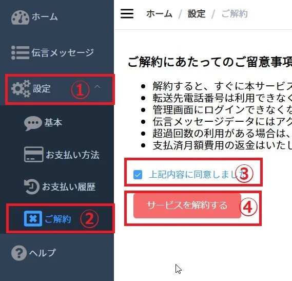 解約するとすぐに本サービスは利用できなくなります。転送先電話番号は利用できなくなります。管理画面にログインできなくなります。伝言メッセージデータにはアクセスができなくなります。超過回数の利用がある場合は、直ちにクレジットカード決済となります。日割りの返金はいたしません。